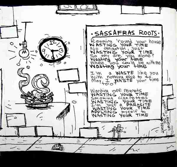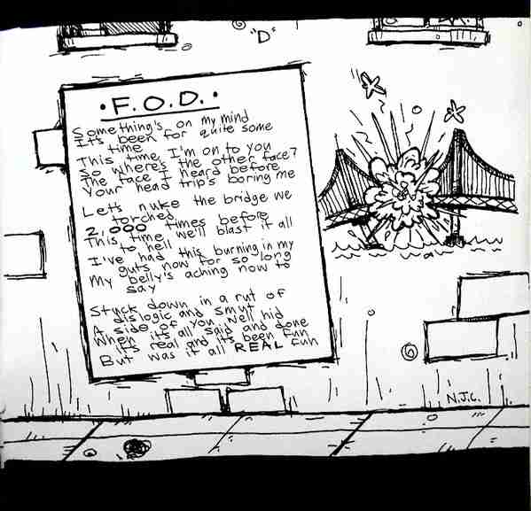 The graffiti reading “Twisted Dog Sisters” refers to these two girls from Berkeley. I think the guy saying “The fritter, fat boy” was a reference to a local cop. The back cover on early prints of the CD featured a plush toy of Ernie from Sesame Street, which was airbrushed out of later prints for fear of litigation; however, Canadian and European prints still feature Ernie on the back cover.