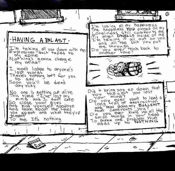 The album artwork by fellow East Bay punk Richie Bucher caused controversy, since it depicted bombs being dropped on people and buildings. The setting is a replica of Berkeley’s Telegraph Avenue. In the center, there is an explosion, with the band’s name at the top.