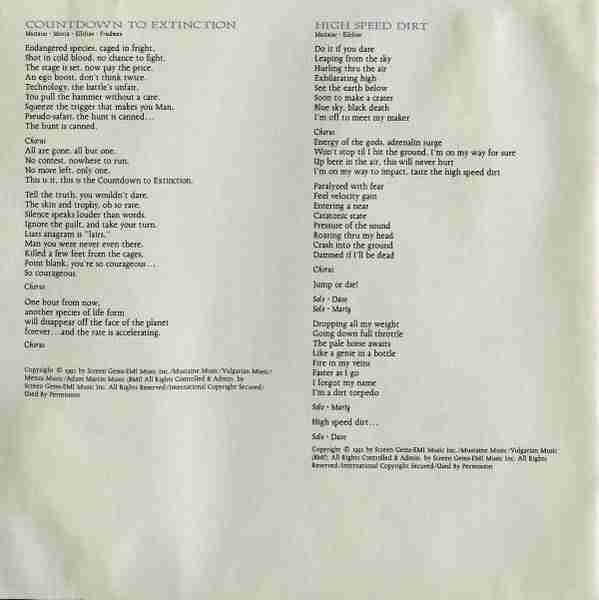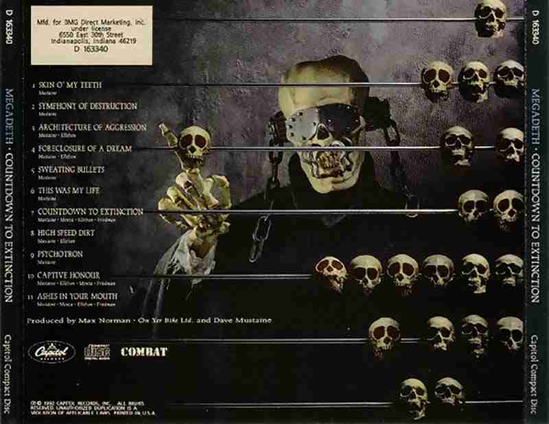 Countdown to Extinction is the fifth studio album by the thrash metal band Megadeth, released on July 14, 1992, through Capitol Records. It was the group’s second studio release to feature the “classic” lineup of Dave Mustaine, Marty Friedman, David Ellefson and Nick Menza, with all of them contributing to songwriting on the album. The album features some of the band’s best known songs such as Symphony of Destruction, Sweating Bullets, and Skin o’ My Teeth, which enjoyed significant chart success and made a great musical impact.