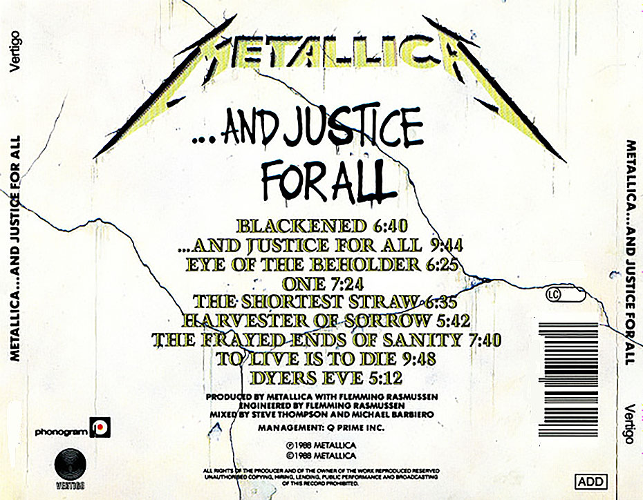 …And Justice for All is the fourth studio album by Metallica, released on September 7, 1988, by Elektra Records. It was Metallica‘s first full length studio (LP) album to feature bassist Jason Newsted, following the death of their previous bassist Cliff Burton in 1986. Burton received posthumous co-writing credit on “To Live Is to Die” as Newsted followed bass lines Burton had recorded prior to his death.