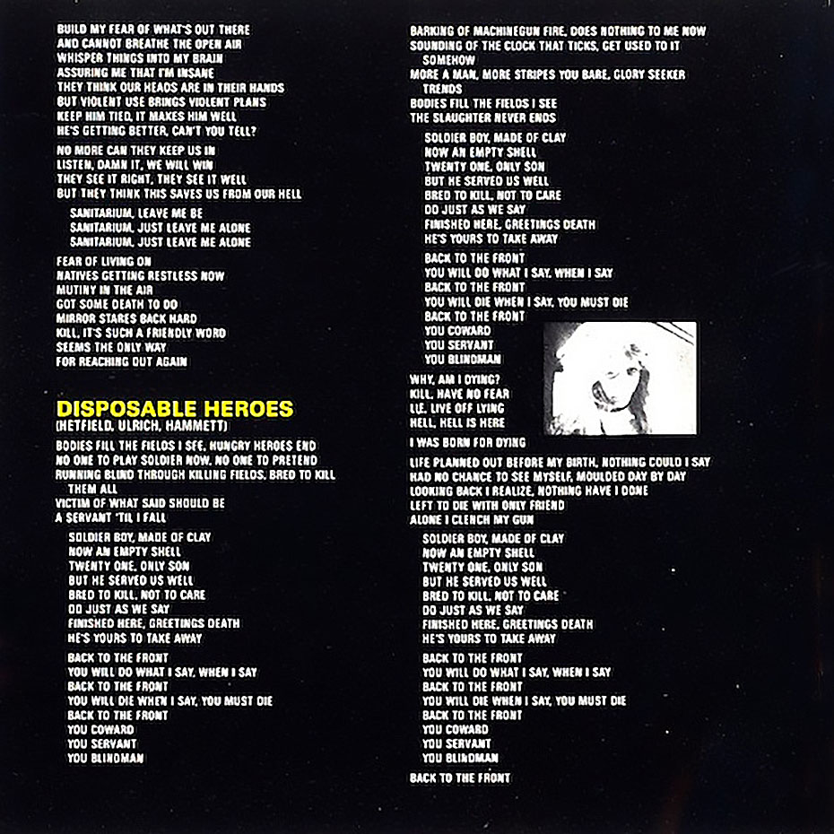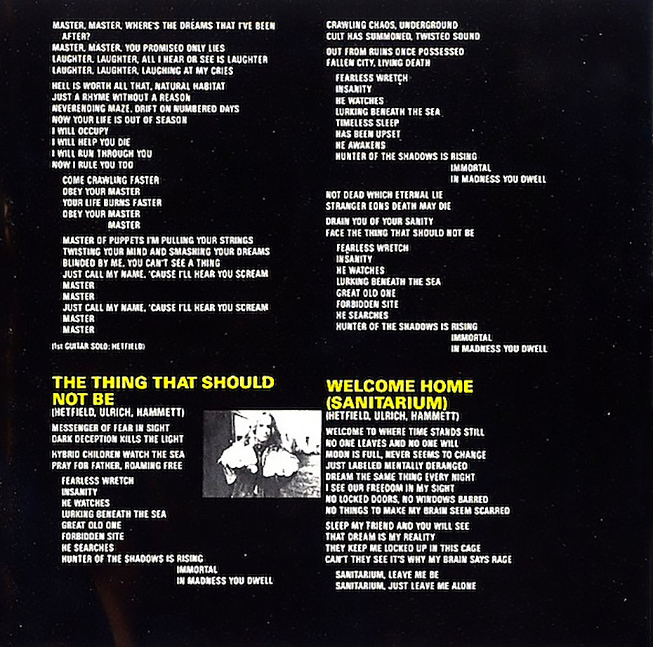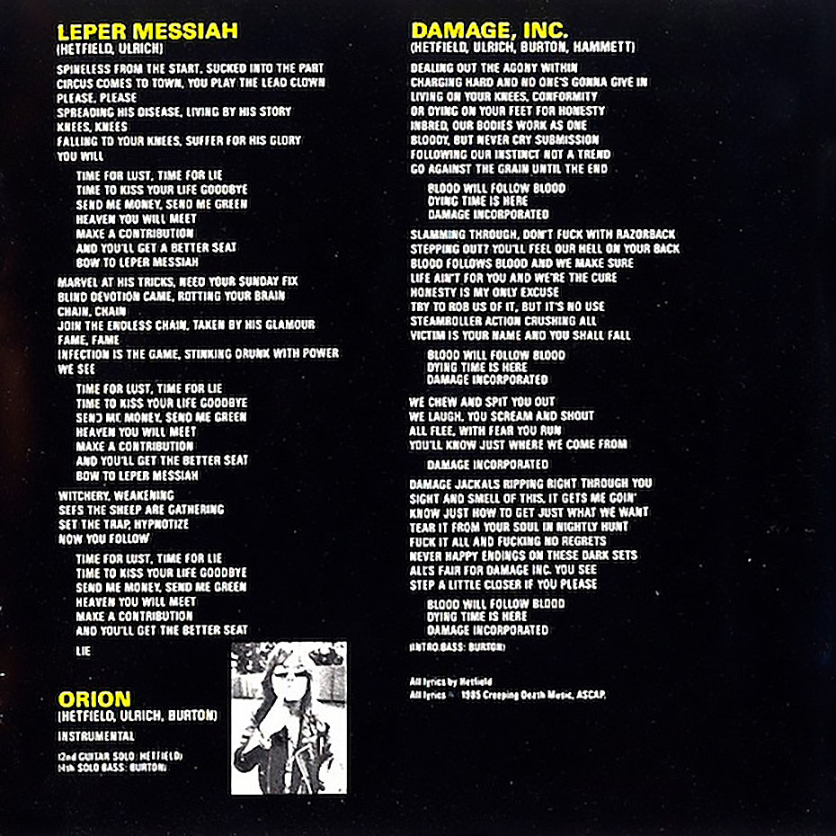 James Hetfield: vocals, rhythm guitar, 1st guitar solo on “Master of Puppets”, 2nd guitar solo on “Orion”
