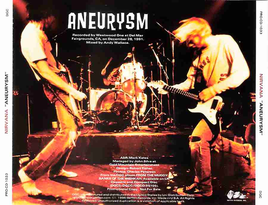 It was first performed live on November 25, 1990, at the Off Ramp Café in Seattle, Washington. A live version of Aneurysm was recorded on December 28, 1991, at Del Mar Fairgrounds in Del Mar, California, was released as the first promotional single from the live compilation, From the Muddy Banks of the Wishkah, in November 1996.