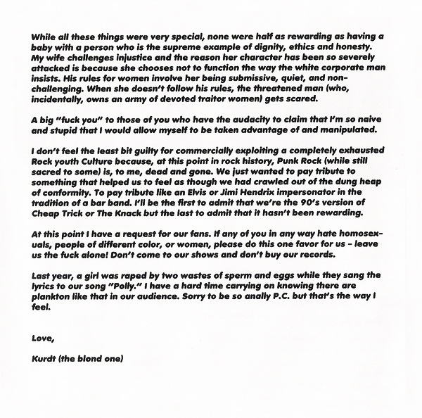 The rubber duck seen on the album’s back cover belonged to art-designer Robert Fisher. The front cover prominently displays a poppy, hinting at Cobain’s struggle with heroin addiction. The first several pressings of the album contained liner notes written by Cobain, including a statement decrying homophobia, racism and misogyny: