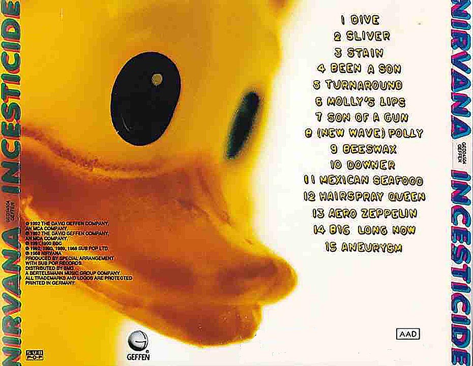 Incesticide is a compilation album and consists of their 1990 non-album single Sliver, B-sides, demos, outtakes, cover versions, and radio broadcast recordings, and as such is not the official follow-up to the band’s breakthrough album, Nevermind. The cover art was painted by Cobain, who is credited as Kurdt Kobain in the liner notes.