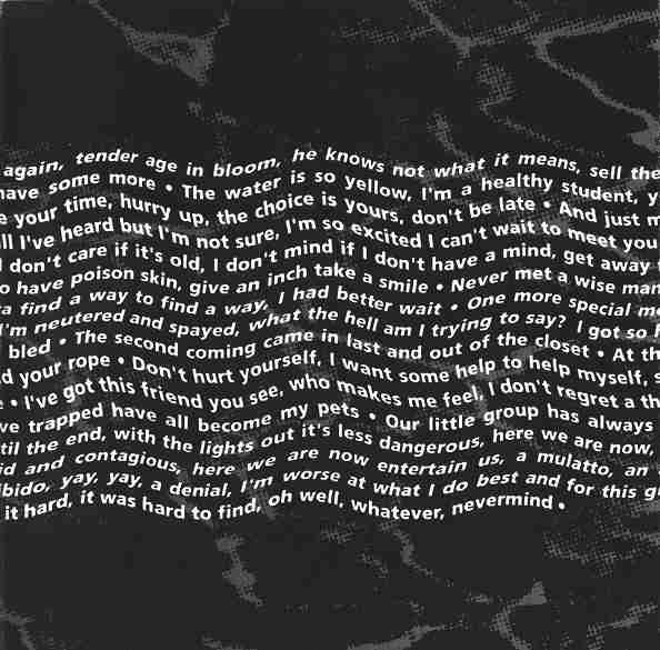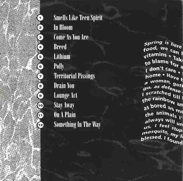 After the initial pressing, CD versions included Endless, Nameless as a hidden track which begins after 10 minutes of silence following Something in the Way, making track 12’s total length 20:35. The song is not included on vinyl versions.