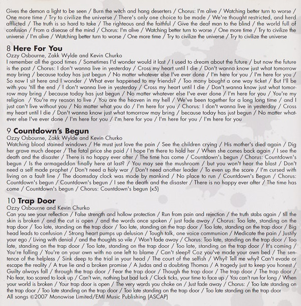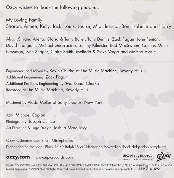 The album was released in several different versions. The original US version was released in a thin, brown digipak with the crownedskull Ozzy Osbourne logo (pictured lower right), and for the rest of the world, it was released in a standard jewel case featuring cover art of Osbourne with Black Rain falling. This cover included a booklet complete with lyrics and album credits. The US version did not include a booklet, lyrics, or album credits. The Japanese release was the same as the other releases outside of the US, except for the fact that it included two bonus tracks, “I Can’t Save You”, and “Nightmare”. The iTunes release of the album included the aforementioned “Nightmare”, plus an exclusive bonus track, (only for those who preordered through iTunes)“Love to Hate”. It also included a printable pdf file of the booklet, complete with lyrics and album credits. This same booklet was later made available as a free pdf download from Osbourne‘s website on June 1. The song “I Don’t Wanna Stop” was also featured as the theme song for WWE Judgment Day 2007.