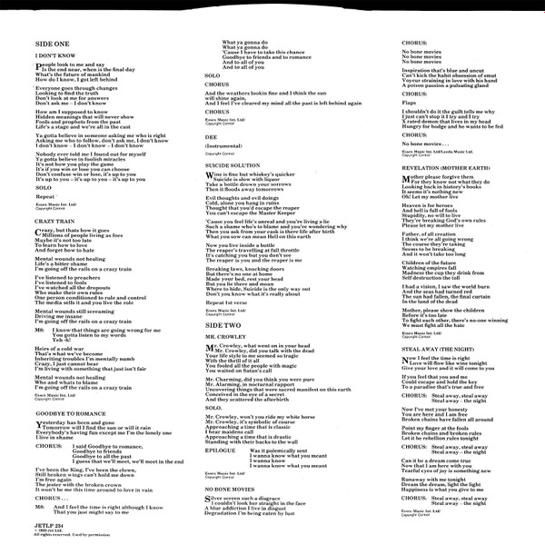 After performing a show in Birmingham, the band hastily returned to Ridge Farm to remix “Goodbye to Romance” for a single. The next morning they were informed that their label Jet Records instead wanted a brand new song to release as a single. Rhoads, Daisley, and Kerslake quickly put together the song “You Said It All”, with drummer Kerslake performing the guide vocal at soundcheck while a drunken Osbourne slept under the drum riser.