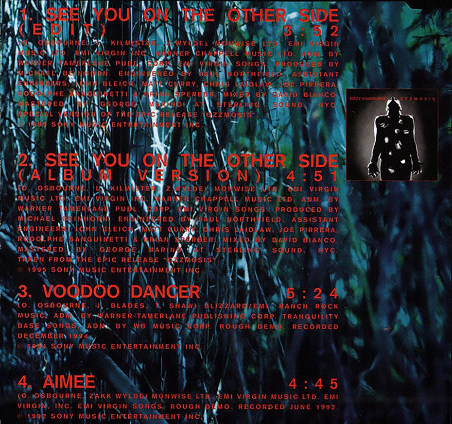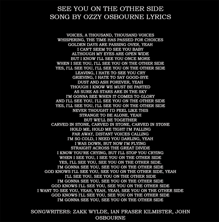 See You on the Other Side is a song by Ozzy Osbourne released on January 9, 1996 as the second single from his 1995 album Ozzmosis. Written with Zakk Wylde and Lemmy Kilmister, about finding hope and reunion in the afterlife, featuring a distinctive silent film-style music video and becoming a meaningful track for fans grieving loved ones, often associated with reunions in the great beyond.