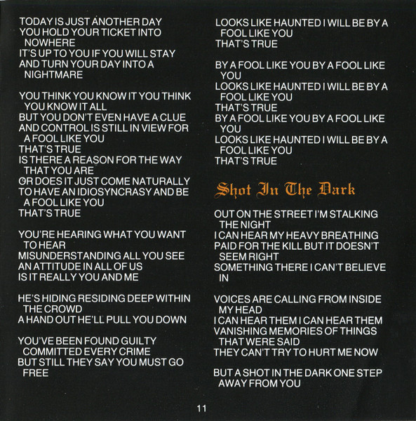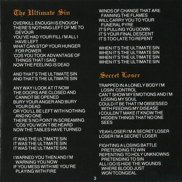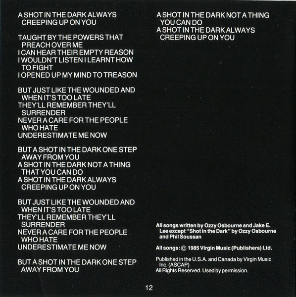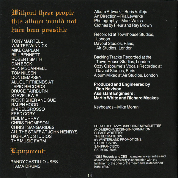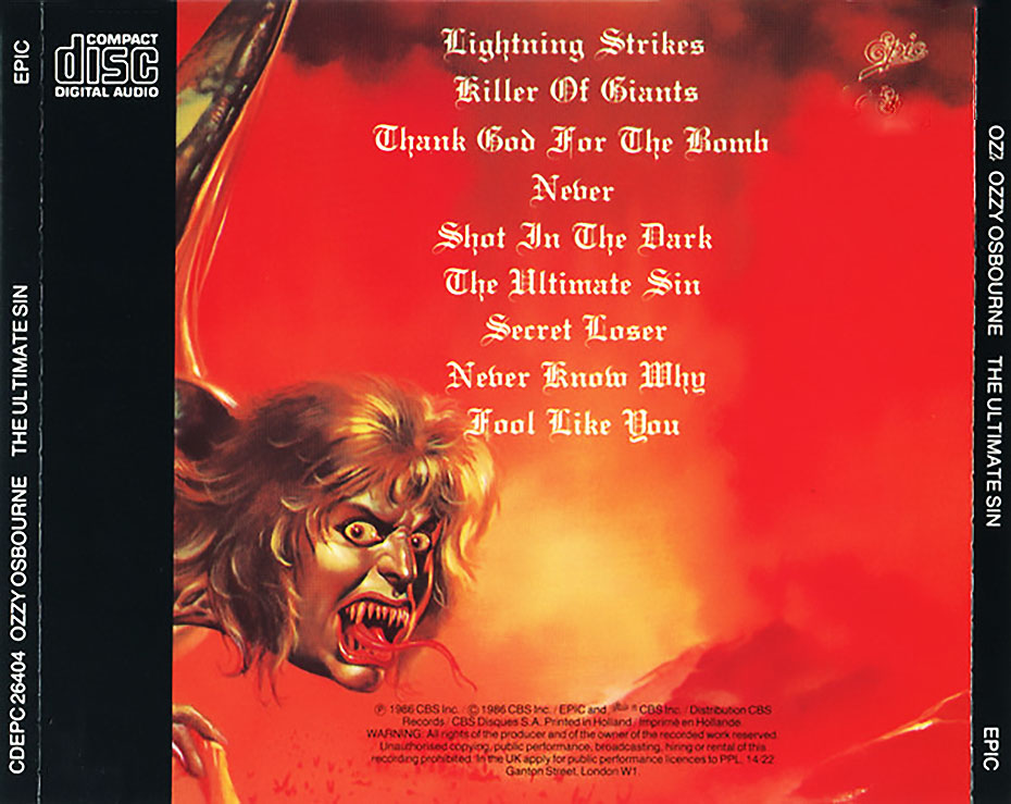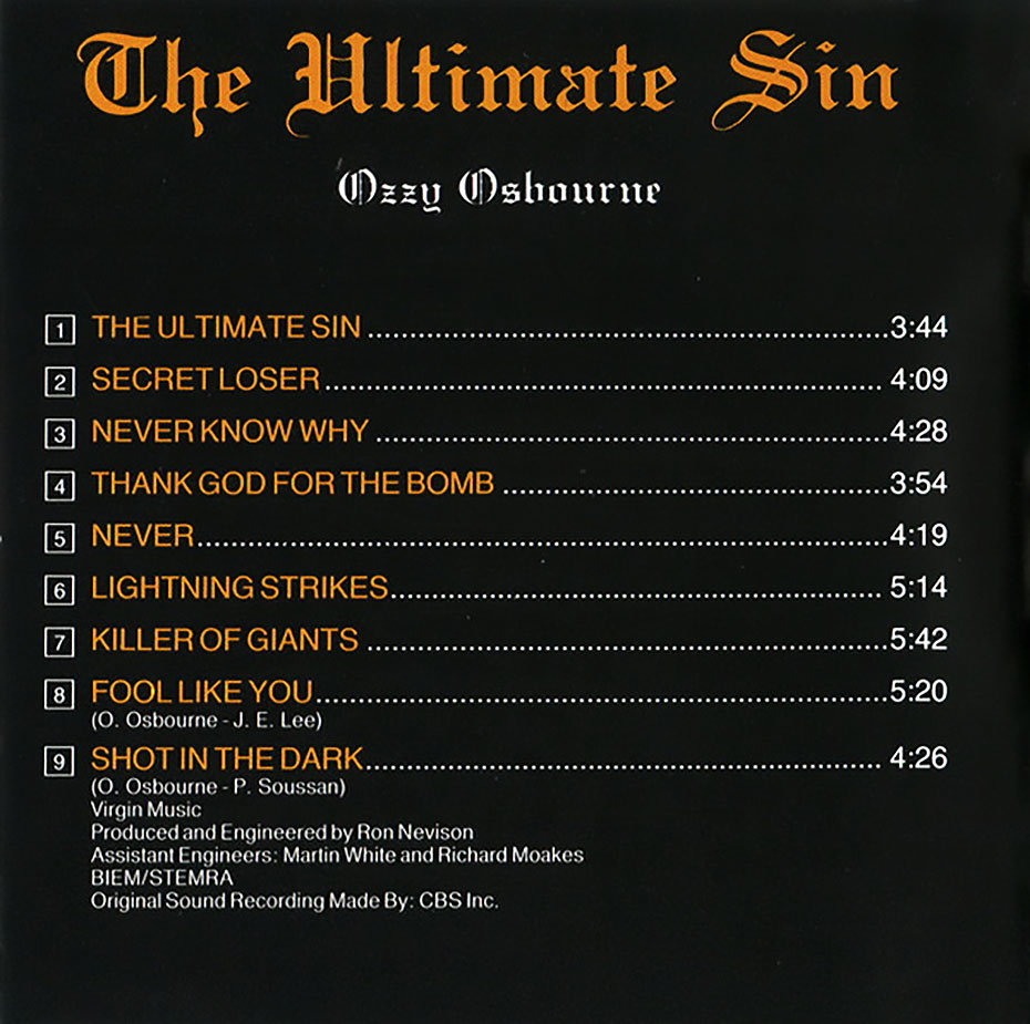 The Ultimate Sin is the fourth studio album by Ozzy Osbourne, released on January 24, 1986. It is the second and last of Osbourne‘s albums to feature lead guitarist Jake E. Lee, the first to feature drummer Randy Castillo, and the only album to feature bassist Phil Soussan, who co-wrote the album’s hit single “Shot in the Dark“. It is also Osbourne‘s last album to feature his classic logo on the cover until 2010’s Scream. The album was awarded Platinum status in May 1986 and was awarded Double Platinum status in October 1994 by the RIAA.