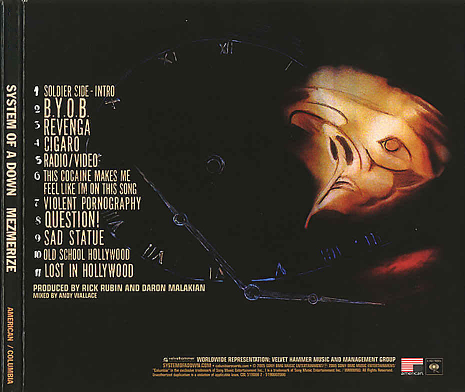 At a length of just over 36 minutes, Mezmerize is the band’s shortest studio album. The album debuted at number one in at least 12 countries, and has since been certified double platinum by the RIAA. The hit single “B.Y.O.B.” won a Grammy Award in 2006 for Best Hard Rock Performance.